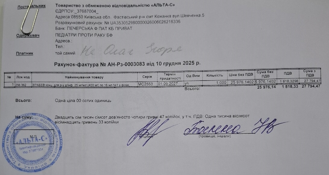 Вже 2 січня мама Ігоря заступає на чергову хіміотерапію. Один лише флакончик хіміопрепарату коштує 27 794 грн (це не всі ліки, що потрібні) . На фото рахунок за минулий флакон, який ми оплатили завдяки вам. І нам знову потрібно диво. Я так боюсь, що всі підуть на новорічні вихідні і цій родині не буде кому допомогти